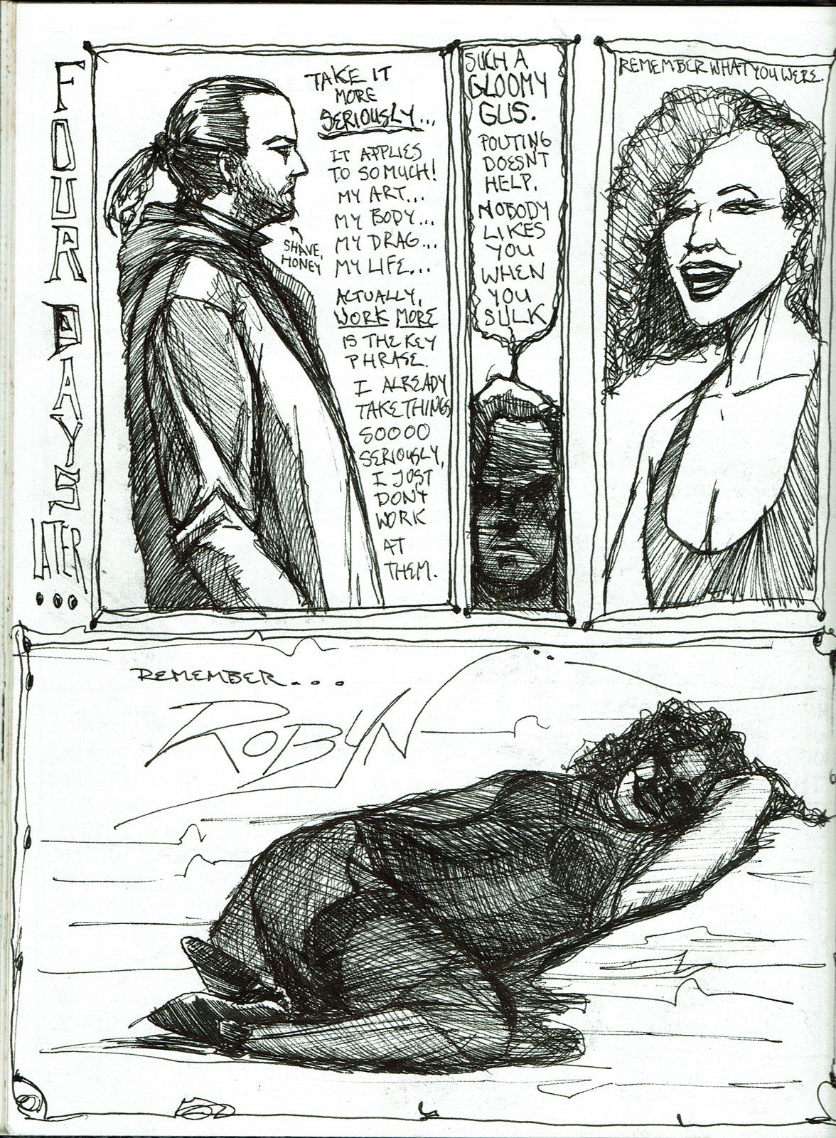 When I came across this sketchbook page I gasped out loud and almost cried. It’s a document of me struggling with holding onto Robyn 1.0. “Remember what you were. Remember ROBYN.”